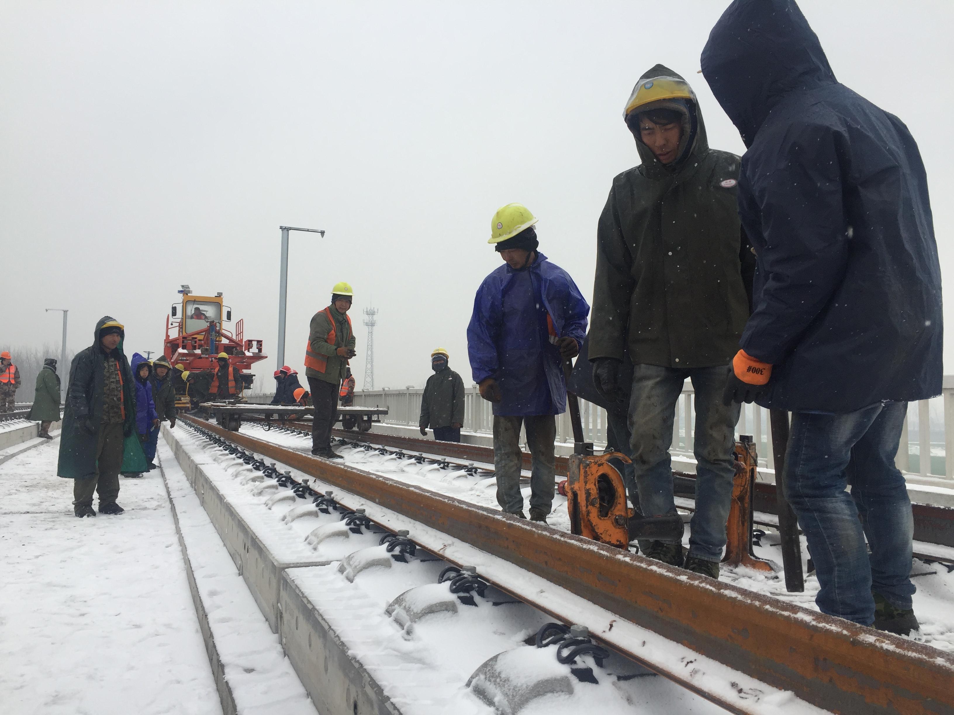 1月9日,漫天飛雪,寒氣逼人,鄭阜高鐵西華段建設(shè)現(xiàn)場卻熱火朝天。為確保工程建設(shè)如期推進,中鐵一局的工人們冒雪以每天至少5公里的速度進行鋪軌作業(yè)。據(jù)了解,鄭阜高鐵西華段全長33公里,鋪軌工作預計5日內(nèi)完工。 記者 張猛 攝
