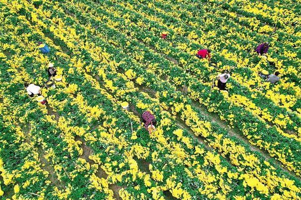 11月13日,項(xiàng)城市新橋鎮(zhèn)南趙村村民在田間采摘金絲皇菊。剛剛離枝的新鮮菊花隨即被送往村里的加工車間烘干,之后由專業(yè)合作社統(tǒng)一收購并對(duì)外銷售。