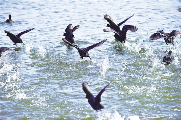 11月16日,在淮陽(yáng)龍湖國(guó)家濕地公園,一群國(guó)家二級(jí)保護(hù)動(dòng)物白骨頂雞在此集結(jié)。
